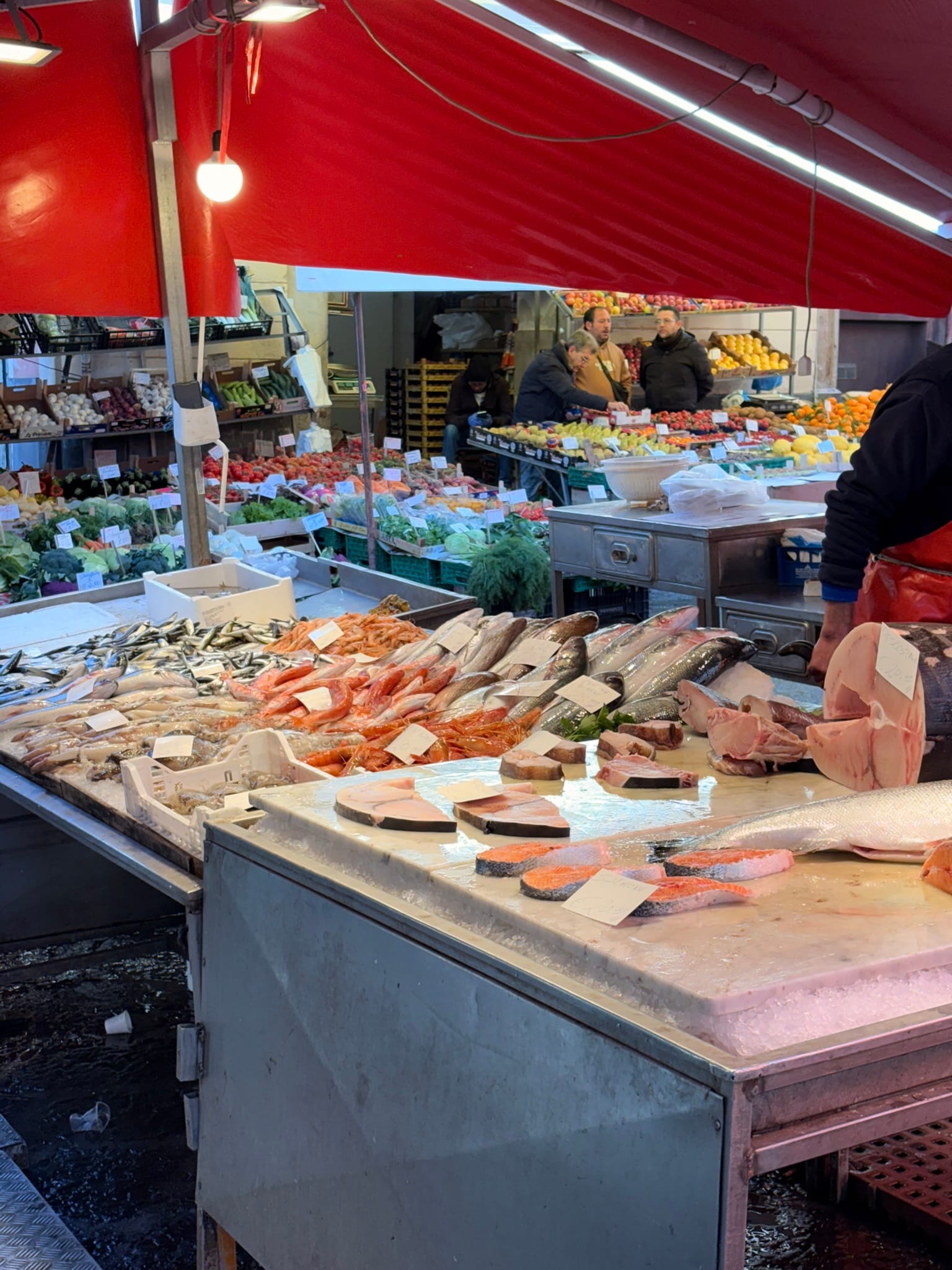 We started at La Pescheria, right behind the cathedral. You leave the polished piazza, turn a corner, and suddenly you are in the middle of shouting vendors and mountains of seafood.