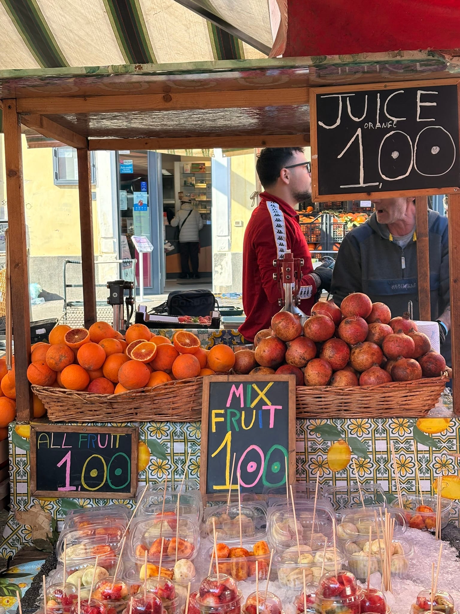 Blood oranges were around 1 to 1.50 per kilo depending on quality. In supermarkets they are often closer to 2 euros per kilo. Not a mind-blowing difference, but still noticeable.