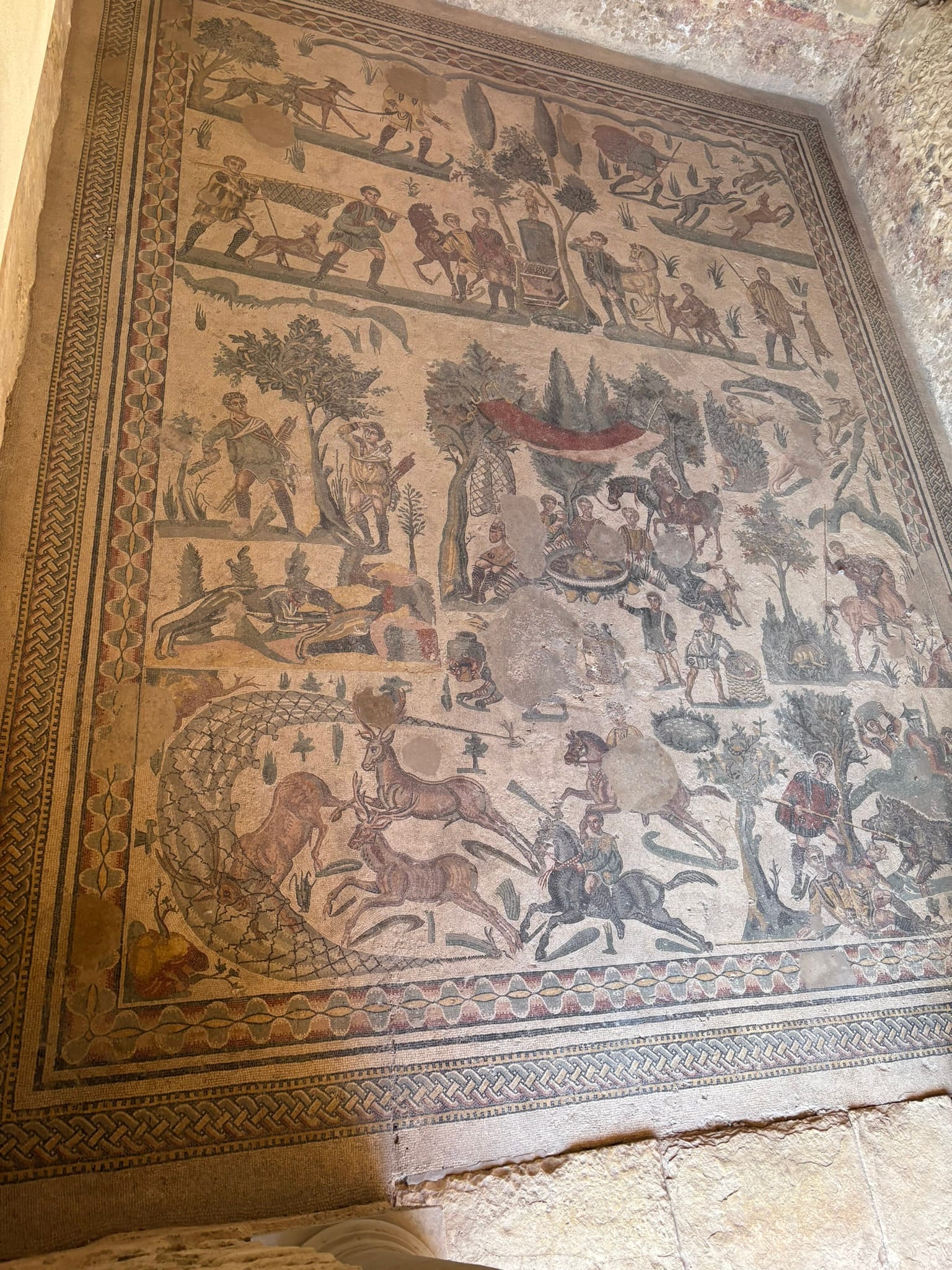 The villa is huge, over 3,500 square meters of mosaics and unbelievably well preserved. It survived because a landslide buried it for centuries, protecting the floors from sunlight, weather, and people. It was most likely a tragedy when it happened, but strangely, it’s the reason we can walk through these rooms today and see the everyday details of Roman life almost exactly as they were.