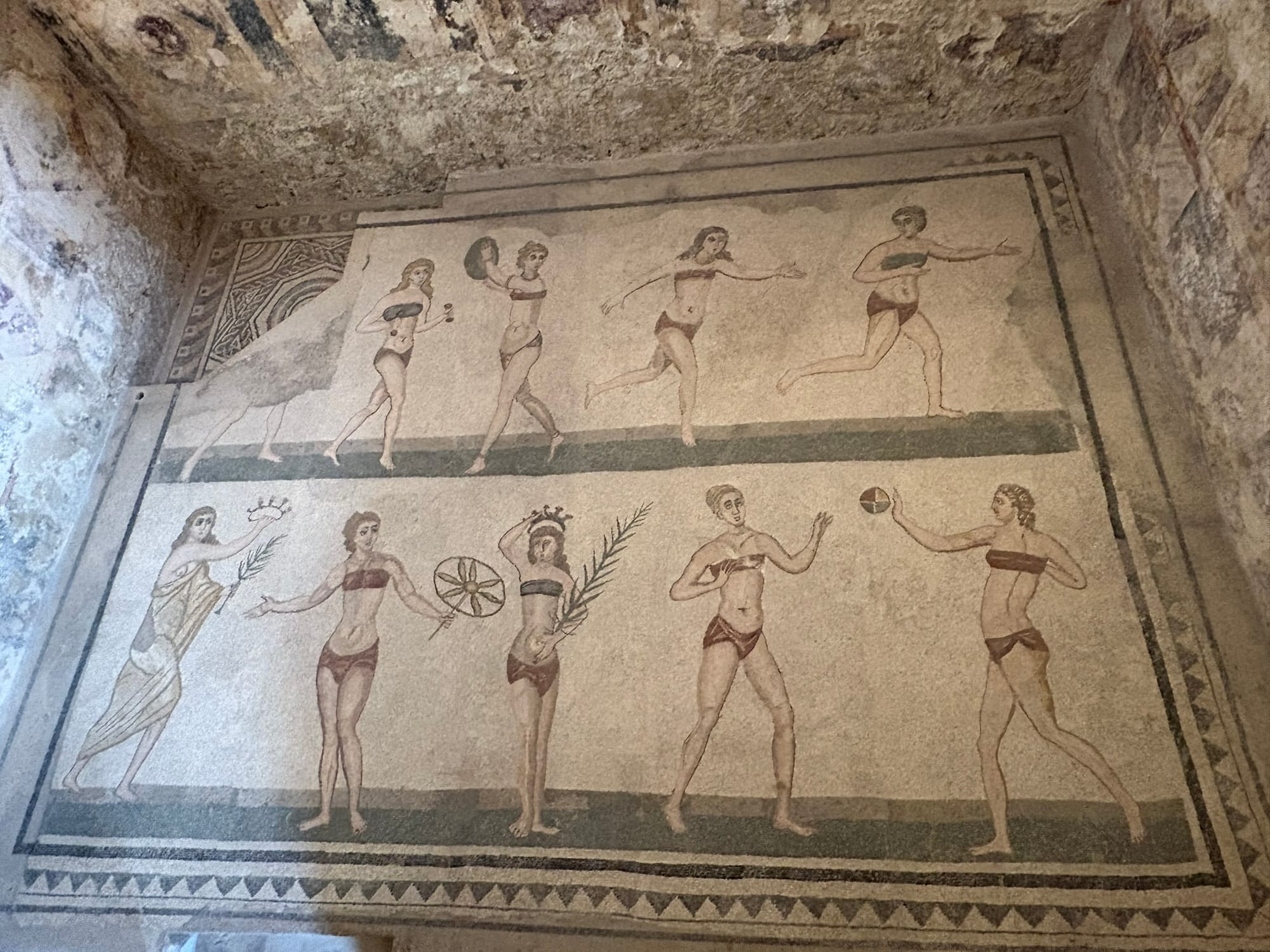 One of the most famous mosaics shows women in what everyone likes to call “bikinis,” but they were actually female athletes. The interpretation changed over time as the villa changed owners, but now it’s understood correctly.